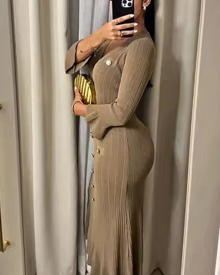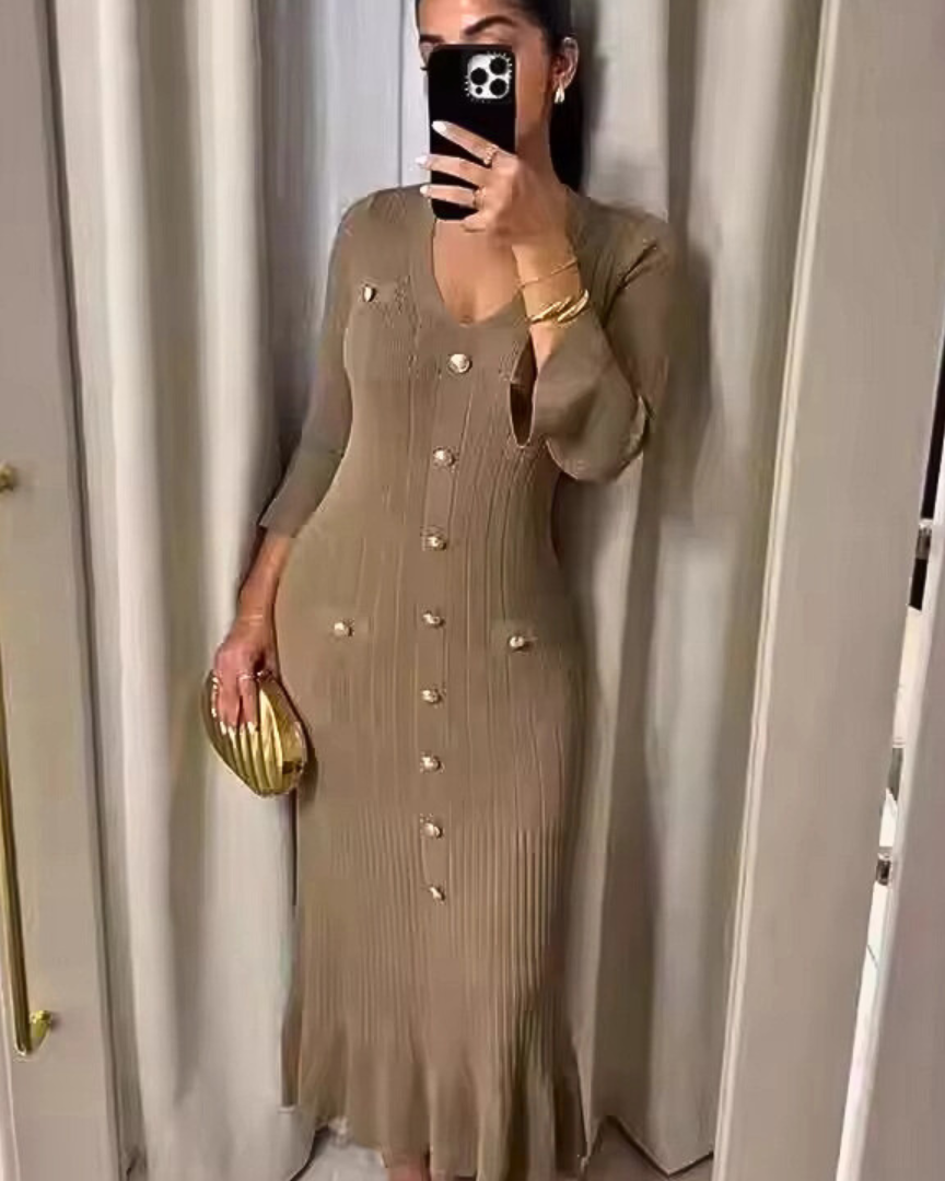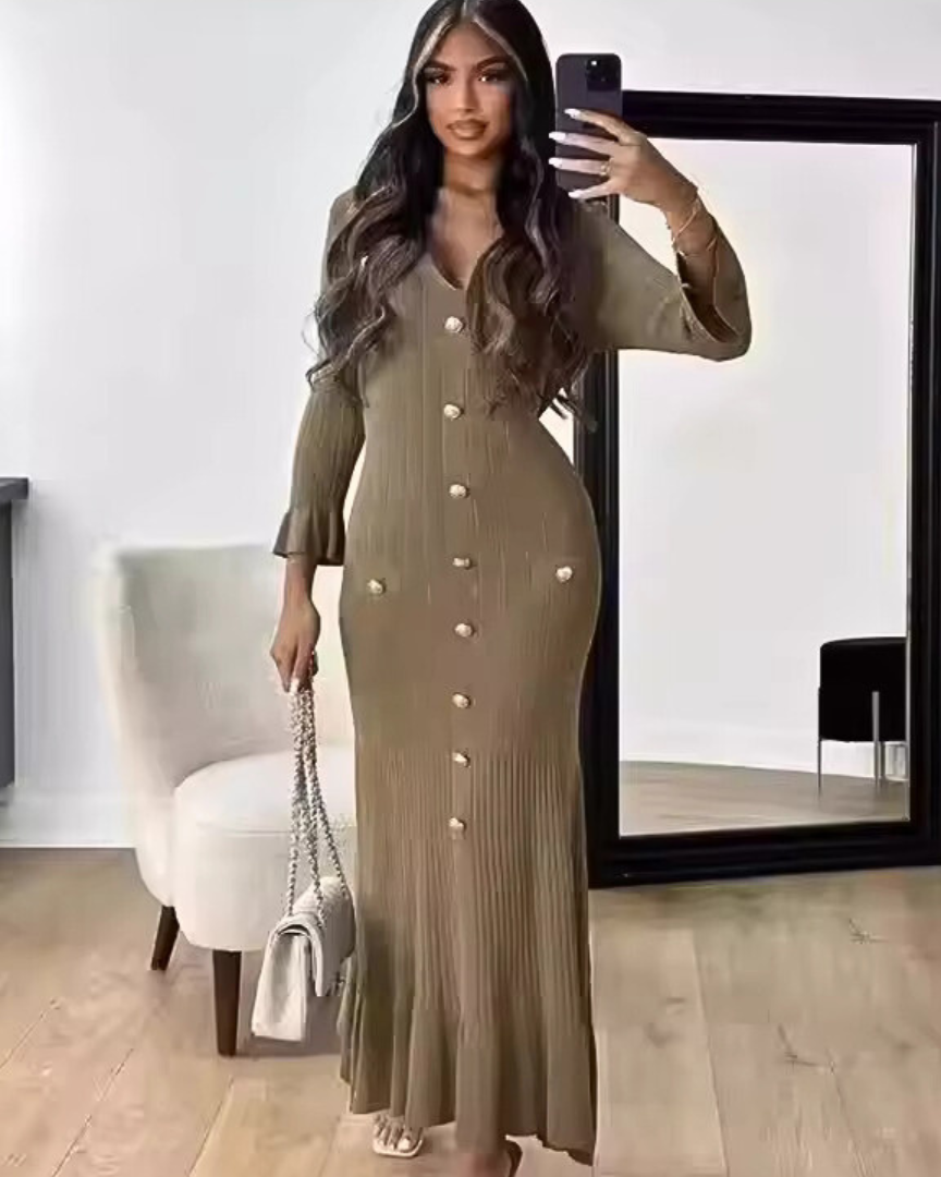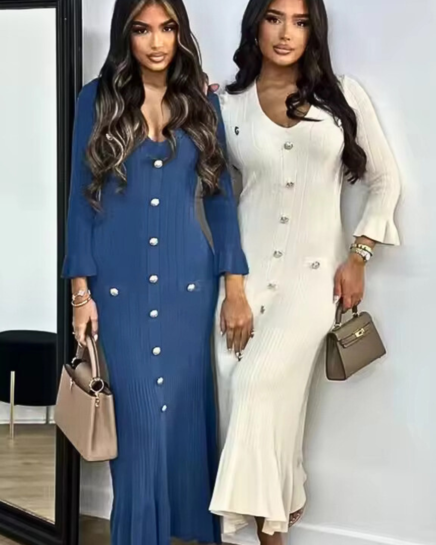From polished mornings to graceful evenings — Eleanor moves with you. The soft knit hugs your figure in all the right places, while flared sleeves and a gentle V-neckline bring timeless elegance. Finished with refined button detailing, it’s your go-to for looking composed and confident.