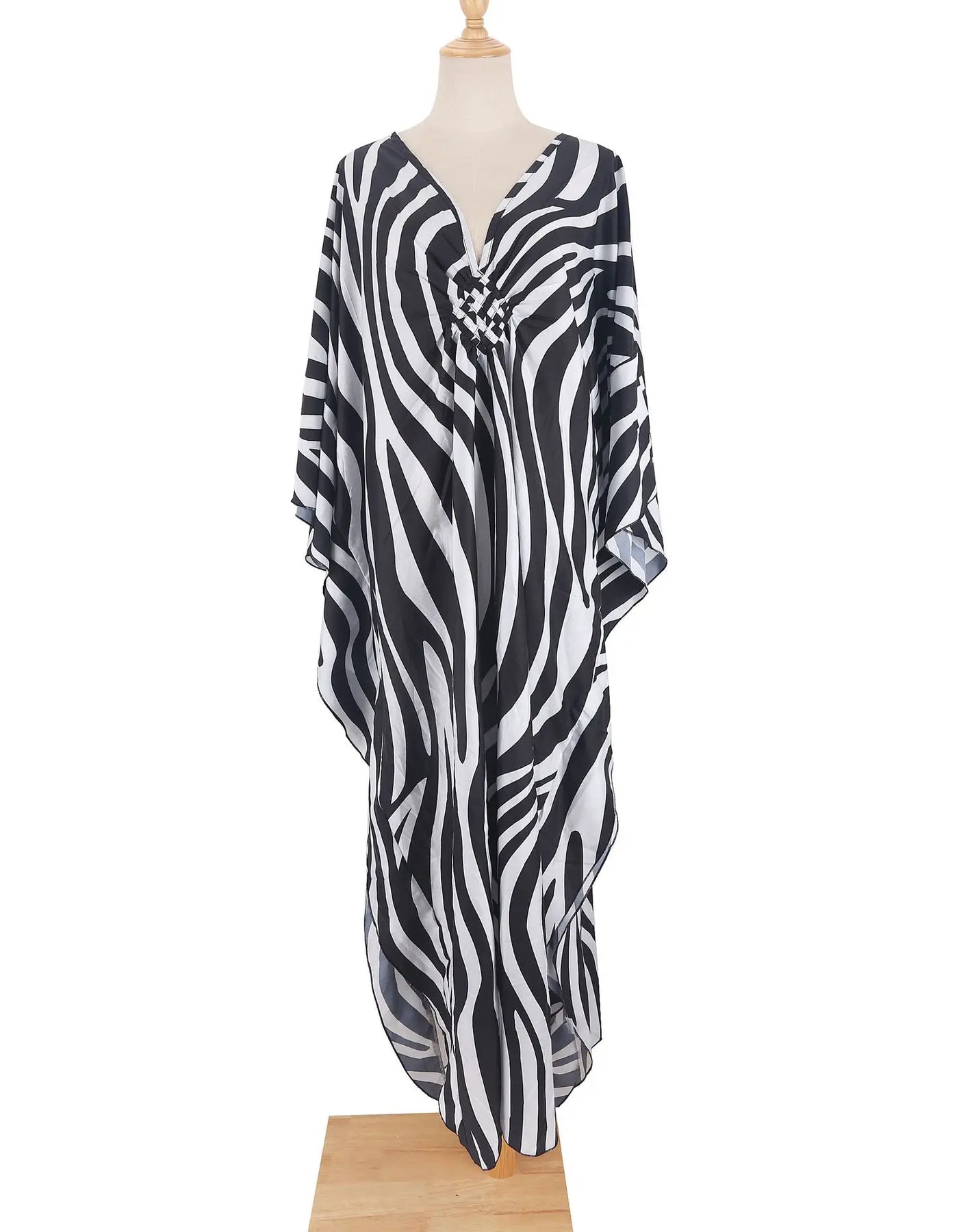 Style this versatile kaftan with your favorite sandals for a relaxed beach vibe, or wear it over your bikini as a chic cover-up. The V-neck and vibrant print make it a standout piece that sparks joy and confidence, perfect for spontaneous outings.