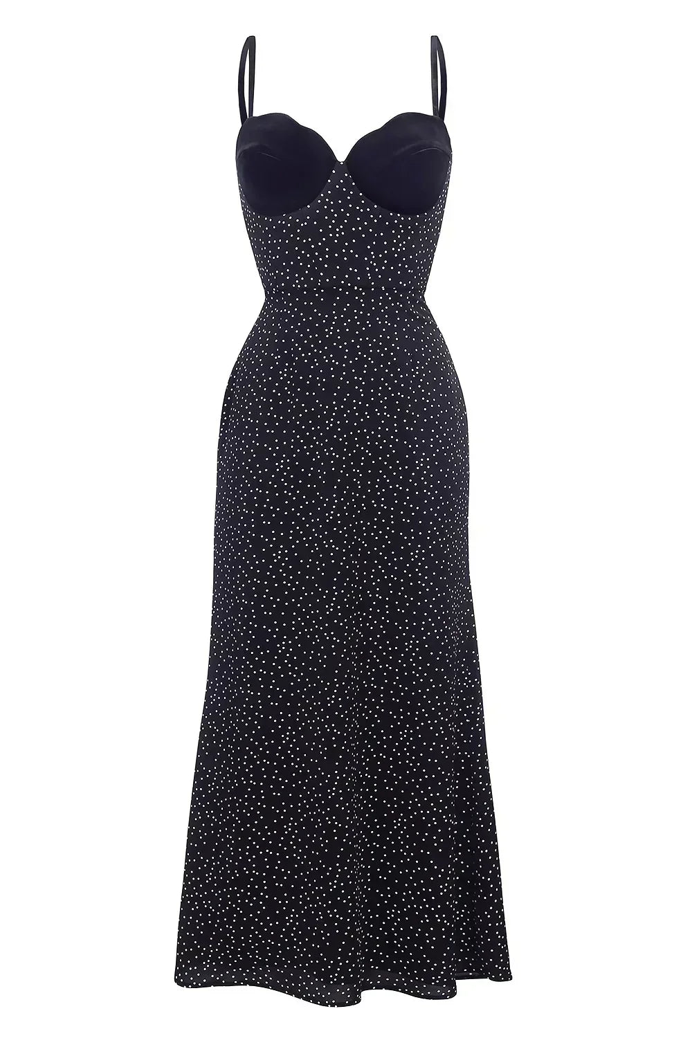 The Selina™ Midi Dress combines timeless elegance with a touch of modern romance. The delicate satin fabric softly drapes over your figure, enhanced by the flattering bustier-style bodice with velvet cups. A subtle polka dot pattern throughout adds a playful yet sophisticated detail, while the adjustable straps provide a customized fit.